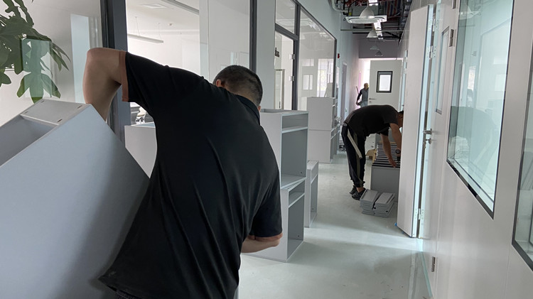 這是另外幾個安裝師傅在走廊中組裝實驗臺下體柜,鋼木柜體材質,鋼架是40*60*1.5mm的,臺面及是18mm的厚臺面。